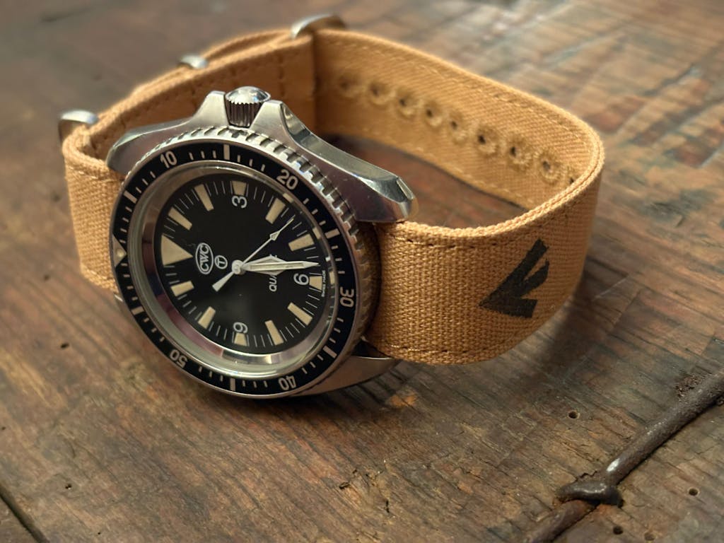 Canvas straps were issued before nylon became available, and will age and look fantastic the more you wear it. They wear in and become very comfortable and made to be very durable. Canvas is a cotton material that will fade as it wears and darken or lighten over time depending on use.